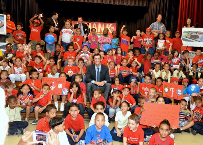 Y’all realize by now that I’m a terrible person. So I’m not above pointing you to this photo of Cole Hamels — who seems like he’s probably a good person — celebrating his foundation’s $300,000 gift to an elementary school. It’s the juxtaposition of his expression and that of the little girl to his right on the front riser: