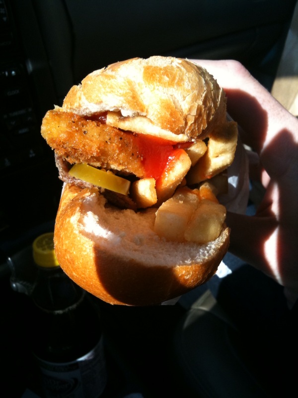 You can’t really tell from the above picture, but there were probably two chicken fingers, two mozzarella sticks, two slices of bacon, a couple thinly sliced steak-umm meat pieces and a few jalapenos in there. Then they topped the whole thing off with french fries. Delicious. I probably should’ve taken another picture while I was midway through the thing, but I was too busy cramming it into my mouth at disgusting speeds.