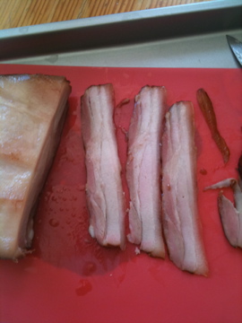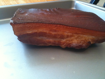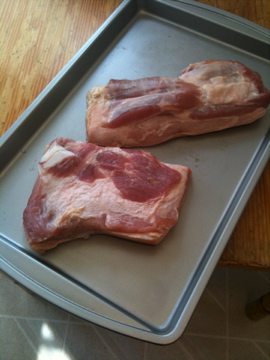 1) Acquire pork belly. This was by far the hardest part. I could only find one place in Westchester that had any — a Latin market in White Plains. I was hoping for a five-pound slab, but he only had a couple two-pound pieces left, but whatever, bacon is bacon, so I took ’em.