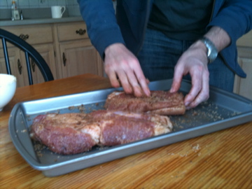 Then you rub salt and brown sugar on the pork belly:
