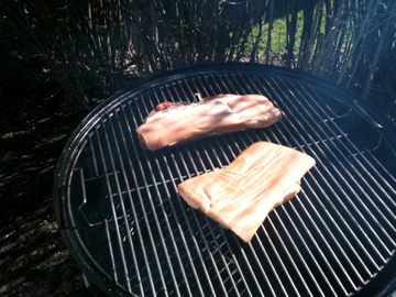 You know how bacon comes with the disclaimer that it’s only partially cooked? That’s the case here, as well. So it’s a little disappointing, because you can’t just rip into it right off the smoker and start eating delicious bacon. Also, that’s actual pigskin on the top there, so you’ve got to slice that off before you slice up the bacon for cooking.