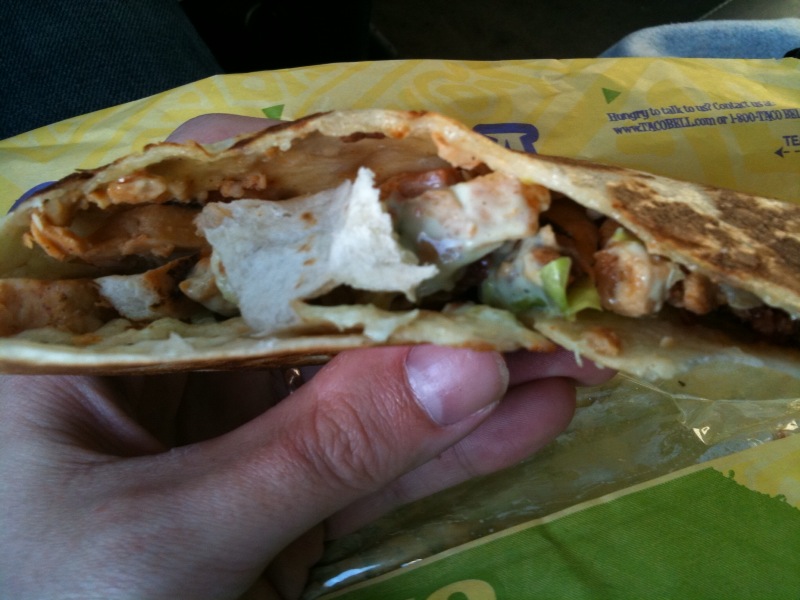 • That would be ideal, but the Bacon Ranch Tortada is more or less flat, so it’d be difficult to photograph the inside parts — the parts that distinguish it from a Crunchwrap Supreme — without propping it up somehow. Plus I was in my car, and way more concerned with eating it than with taking a decent picture.