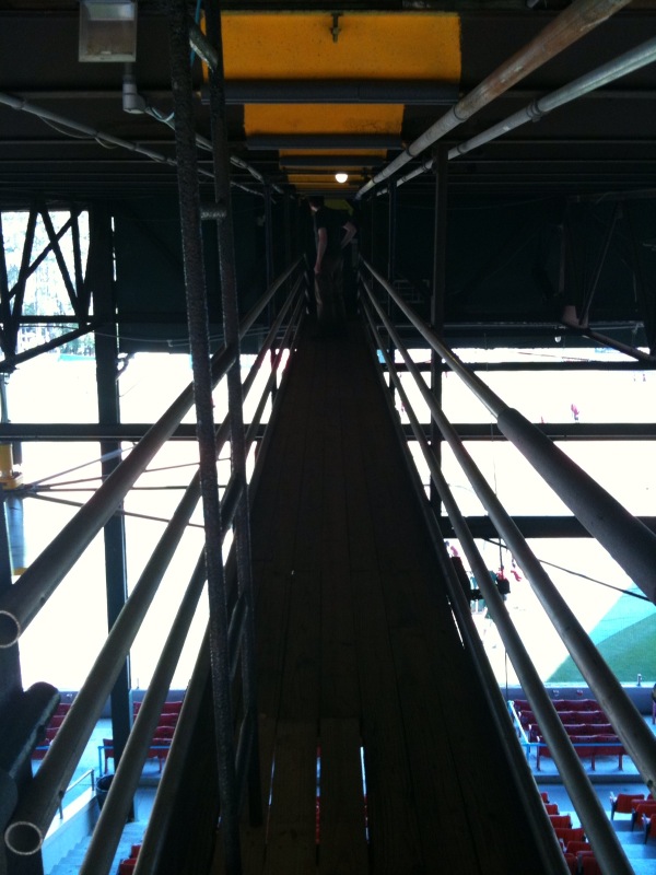 I’m here at the ballpark — Historic Grayson Stadium, just 84 years young — perched in the “trailer in the sky” of a press box, as Toby Hyde describes it. The catwalk to get up here was just a tiny bit terrifying: