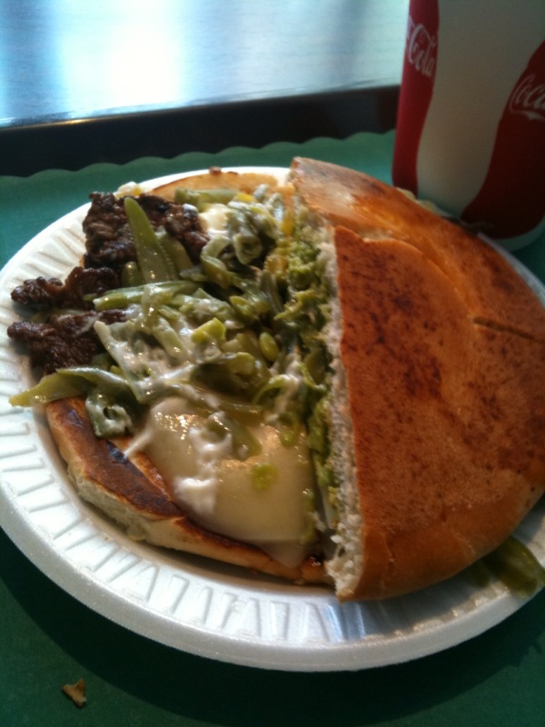 The Construction: Thinly sliced steak with string beans, mayo, white cheese, avocado and a banana-pepper/cilantro sauce on fresh-baked Chilean bread. The sandwich comes with tomatoes, too, but I ordered mine without them because they’re not my cup of tea.