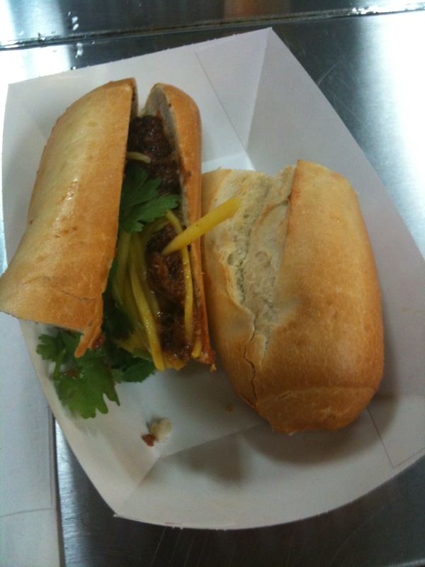 The bread was warm, crusty and flaky on the outside and soft and tasty on the inside like all good French bread should be. The beef was straight up delicious. Like I said, it was sweet and spicy — but not too spicy, at all, just a nice hint of a kick. And the curry and whatever else is in there (I’d guess garlic, chili and maybe some basil, but I’m hardly a super-taster) made it awesome.