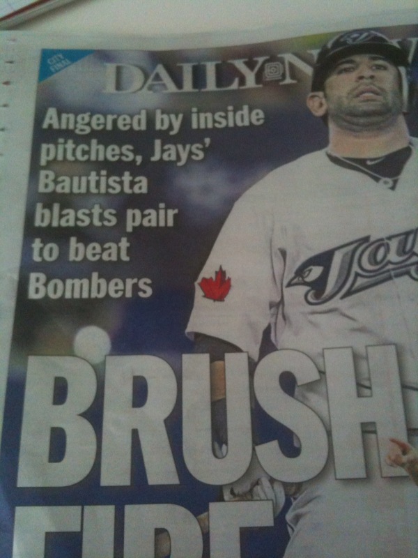 Not to mention the fact that the first home run came before the inside pitch in question. Unless the DN is suggesting that Bautista has some sort of Psychic powers and knew that he would in fact be picthed inside later in the game, thus angering him enough to want to hit the first home run.