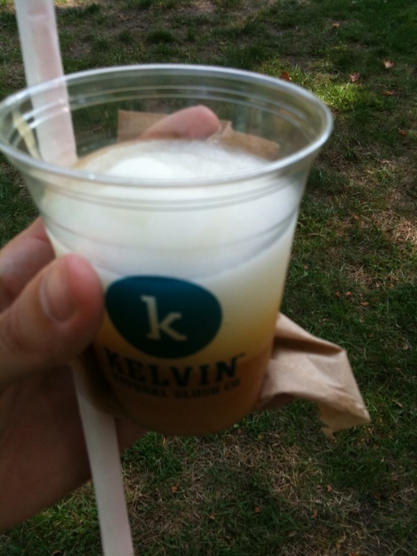 I’ll have a full write-up tomorrow, once I’ve processed and digested. But for now, enjoy a picture of perhaps the best thing I tried — and this surprised me — the “governator” from Kelvin Natural Slush. That’s a green tea and ginger slush with real pear mixed in. Outstanding. Picture doesn’t do it justice.