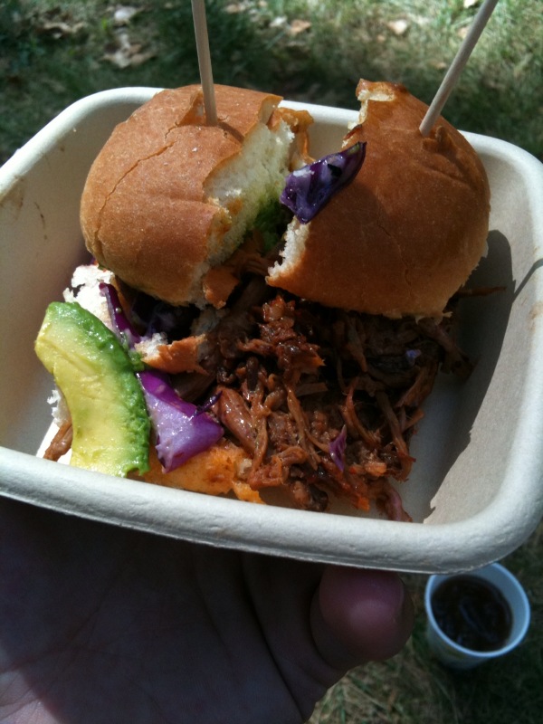 What’s that down there? There’s food out at Mexicue — one of the carts I’ve eagerly anticipated. Is it me, though, or is this amazing-looking BBQ brisket slider only pretty good? Is there spicy slaw on there? It says spicy slaw, but I don’t taste anything spicy? I can’t identify anything I don’t like on here, but I can’t — what’s happening to me? Time to slow down. Take a break.