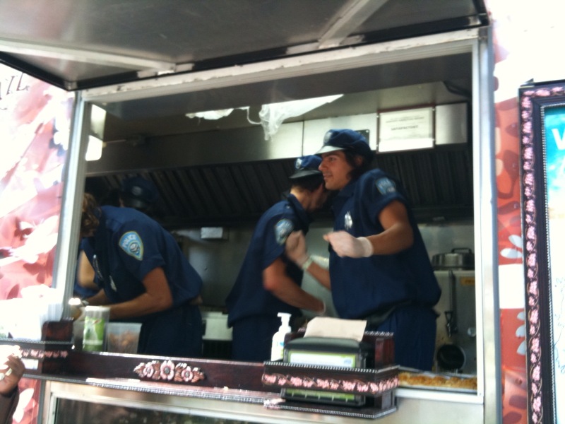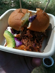 A stop at Cinnamon Snail, a vegan truck out of Jersey with a bunch of dudes dressed as cops dancing inside. Normally I shy away from anything labeled vegan, but I’m here at the Vendys to enjoy all sorts of foodstuffs, and I figure if they made it this far they’re probably pretty good at it. Plus the dancing guys in cop outfits remind me of GOB’s stripper friends from Arrested Development. “Michael, these men are real dancers; they haven’t done any hot policing.” They have, however, apparently figured out how to make elegantly presented and downright palatable vegan food, though I begin to suspect it is quite starchy as I take my second bite of delicious mashed sweet potatoes. No more of you, tubers! You’re taking up valuable meatspace!