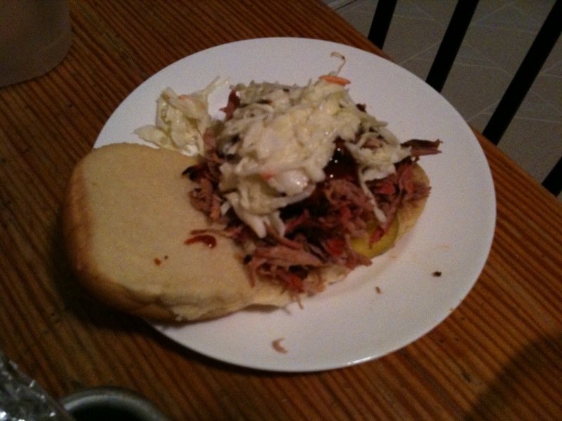 I think the pickle was at least part of the problem. I used sandwich-stacker pickles that had been sitting in my fridge for months, so they were never really crunchy. Plus I think I would have been better off with a couple slices of bread and butter pickles or something, which offer more skin, more surface area, and so, more crunch. The cole slaw — which was good, but unexceptional, just cole slaw — adds some crunch, but the pork is so soft that it’d be nice to have it bookended by crunchy things, and the pickle didn’t pull its weight. Plus it sogged up the bun with pickle juice. Delicious, delicious pickle juice.