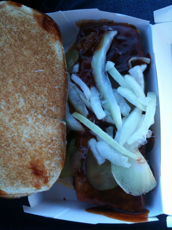 I theorized before I did that the McRib might not seem so impressive this time around. The way I figured, the last time I ate a McRib I probably didn’t have nearly as much experience with “real” barbecue food as I do now. I really only began to understand the great joys of wood-fired meat in college — a time for expanding horizons, no doubt — thanks to the excellent work of a place called Rockland’s right up the street from the bar where the Moo Shoo Porkestra played weekly. I mention my band only so you can better understand my lifelong dedication to pork (and also, maybe, because I’m still proud of the name).