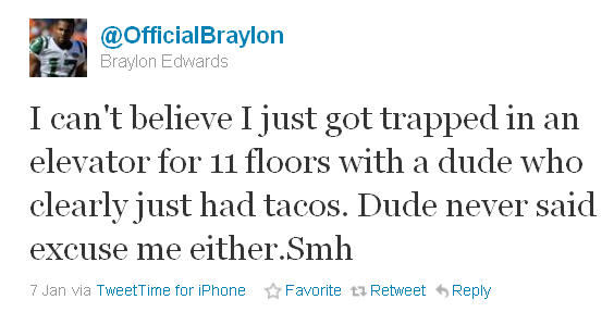 Braylon Edwards’ harrowing elevator experience Posted on January 10, 2011 by Ted Berg From Edwards’ Twitter, via Mike Rudner. Share this: Click to share on X (Opens in new window) X Click to share on Facebook (Opens in new window) Facebook Like Loading... Related