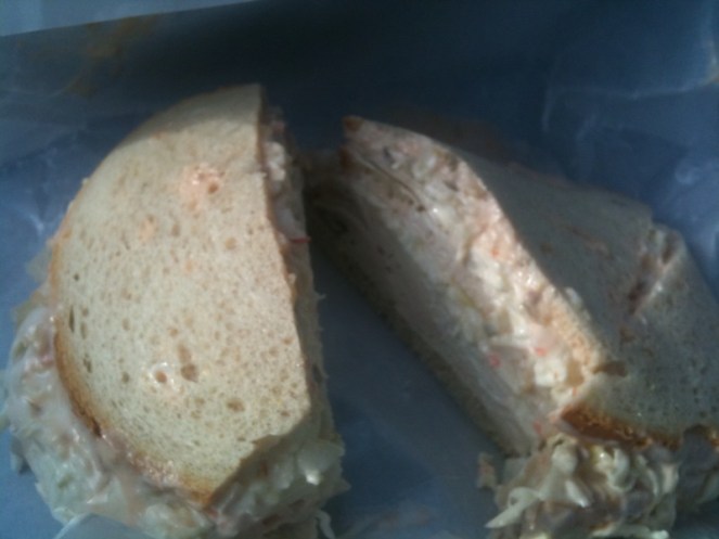How it tastes: Like cole slaw. There’s turkey and cheese in there somewhere, and if I think about it I can kind of pick out the creamy sweetness of the Russian dressing, plus the bread is soft, fresh and excellent. But the overwhelming flavor here is unmistakably the cole slaw that’s dripping out the sides of the sandwich and onto my pants.