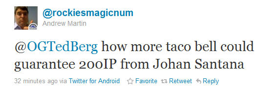 I strongly advocate more Taco Bell, but I don’t think anything could guarantee 200 innings from Johan Santana, in 2011 or anytime beyond, really. It seems like Santana’s recovery is becoming a pretty big story in Mets camp, and, at the risk of sounding like Debbie Downer I’ll say this: Don’t hold your breath.