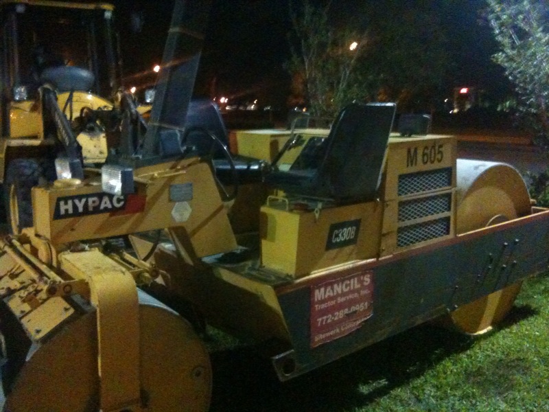 It appears to be some sort of ground zamboni, as I’m pretty sure the right-most roller thing in this picture had hoses behind it — as if it spits out water. Is it for smoothing pavement? If anyone has more knowledge of heavy machinery, feel free to chime in.