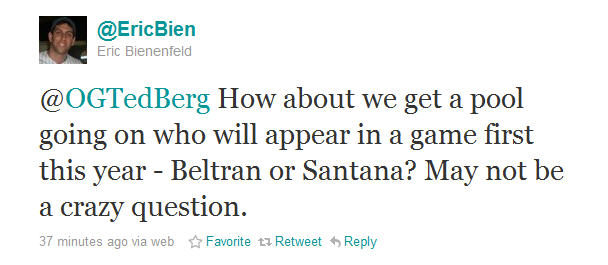 I’d put my money down on Beltran still. As frustrating as it is to follow along with the outfielder’s seemingly very slow rehab process, Santana is so far off and shoulder surgery is so very tough for pitchers to come back from. Fun fact: I’m the one who set the April 21 over-under that Matt Cerrone used for MetsBlog. It was a total guess, but it’s my total guess.