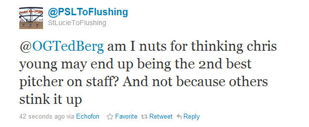 Of course, speculating if Young will be the second-best pitcher on the Mets begs the question: Who will be the best pitcher on the Mets? Based on 2010, you’d have to say Dickey. But awesome though he is and with all the caveats about being relatively knew to the knuckler, Dickey only has one good season under his belt. Mike Pelfrey probably is who he is at this point: A decent but unspectacular innings-eater. Jon Niese should improve off his rookie season. To me, it’s hard to pick a clear favorite.