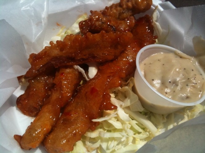 I got a hankering for some mozzarella sticks around lunchtime so I walked up to a little burger place near my hotel called Roxy. They didn’t have any on the menu, but they did have something called “Deep Fried Battered Bacon Planks,” so obviously I got that.