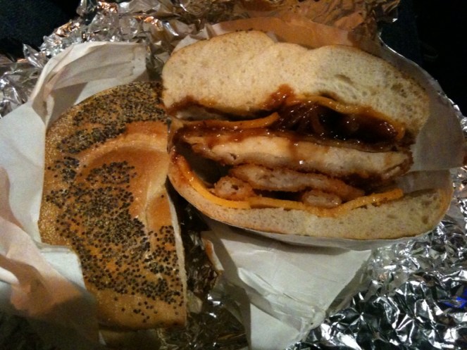 The construction: Chicken cutlet with cheddar cheese, bacon, onion rings and barbecue sauce on a garlic roll.