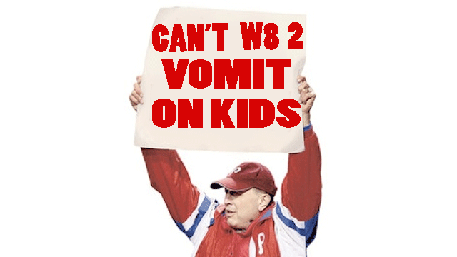 *- Obviously I didn’t really. In reality this man may not endorse vomiting on children. Also, I originally had the sign say “SOMETHING HOMOPHOBIC!” but I decided that there are unfortunately plenty of Mets fans that yell homophobic things at games and I probably should avoid vaguely accusing the entire city of Philadelphia of homophobia.