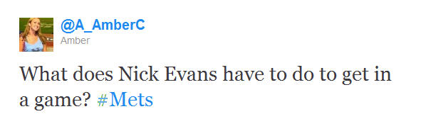 Maybe that wasn’t just a Jerry Manuel thing Posted on May 25, 2011 by Ted Berg Evans has been up since May 18, in which time the Mets have played six games. He has seen two plate appearances. Share this: Click to share on X (Opens in new window) X Click to share on Facebook (Opens in new window) Facebook Like Loading... Related