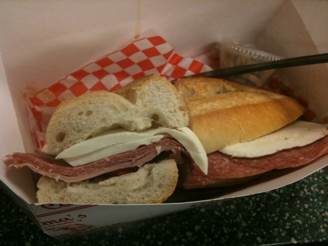 The Mama’s Special is pepper ham, salami and fresh mozzarella on Italian bread. It’s huge, probably big enough to split unless you’re really hungry. It comes with red roasted peppers, which I’m all for, and pickled mushrooms, which are not for me. Everything’s pretty great here; the meats are salty and tasty, the bread is fresh, and the cheese is amazing.