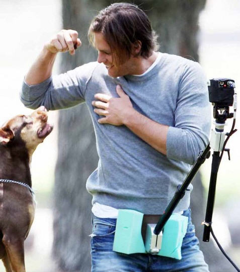 Here is Tom Brady smiling at a dog while flexing his biceps with a camera attached to his groin: