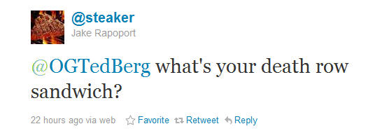 Seriously why do so many people ask about what food I’d want if I were on death row? Do you know something about me that I haven’t figured out yet? Why not ask what food I’d want if, I don’t know, a genie came out of this here Vitamin Water Zero bottle and offered me any sandwich in the world?