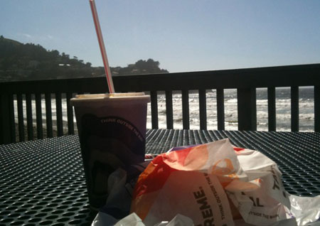– I made it to the World’s Nicest Taco Bell, in Pacifica. Words can’t really describe how nice that Taco Bell is. Here’s a photo of the view from its outdoor seating area, which doesn’t really do it justice at all:
