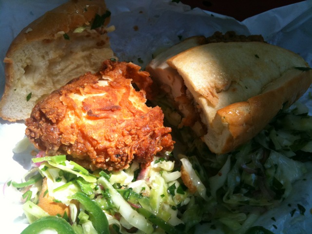 The construction: Breaded fried chicken breast and slaw on a “torpedo” roll.