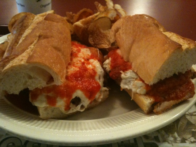 The construction: Chicken cutlet with melted fresh mozzarella and marinara sauce on a hero.