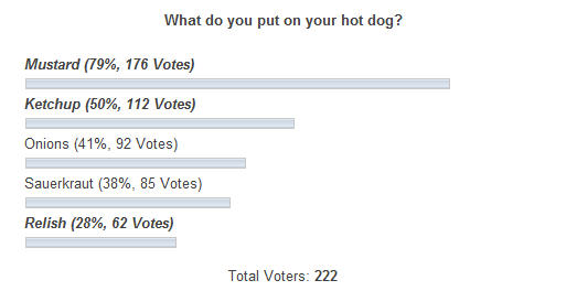 Yesterday’s hot-dog condiment poll is getting bumped off the front page by this post about yesterday’s hot-dog condiment poll. Here’s what the results look like as of right now: