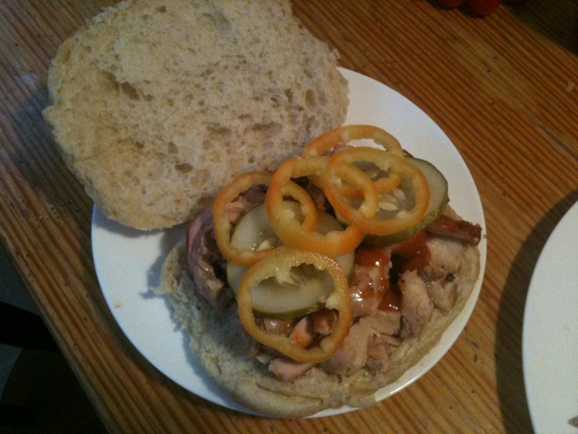 We had a package of chicken thighs in the freezer that I wanted to get rid of, so I thawed it out and smoked them over a mix of oak and cherry wood chunks. Before they were finished, I brushed on some store-bought, mustard-based barbecue sauce to give ’em a little bit of a glaze. When they were done I sliced them up to better distribute them across the roll.