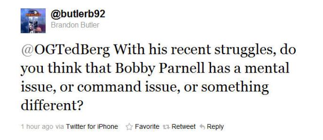 The command issue is an easier one to tackle: Yes, he has a command issue. Parnell has walked 4.1 batters per nine innings for his career and 4.4 on the season. There are plenty of effective relievers who can work in that range, but most of them strike out even more batters than Parnell does — in this season and across his career.
