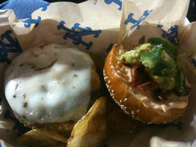 The Mex Burger is a burger with bacon, two slices of cheese — one pepper jack, one cheddar — guacamole, jalapenos and chipotle aioli on a brioche bun. It costs $10 and is available from the “Keith’s Grill” concession on the field level in left field. It looks like this: