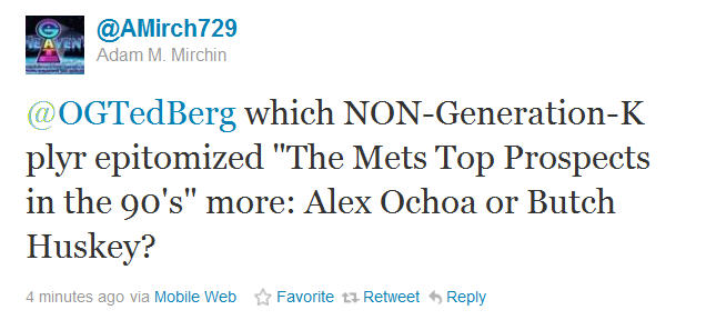 It’s Ochoa. Butch Huskey epitomizes many things, among them the general meaninglessness of Spring Training stats, what a 245-pound man can do to catchers when plowing into them at full speed, and baseball’s rich tradition of great names. But since Huskey enjoyed a couple of reasonably productive seasons as a Met, it’s hard to call him an utter failure as a prospect.