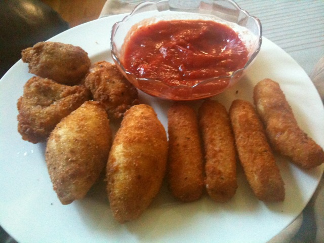 The so-called calzones are the big winner here. And I imagine you could figure out how to make them at home pretty easily. They’re just large shells (as in the pasta shape) stuffed with ricotta, mozzarella and ham, presumably dipped in egg then rolled in bread crumbs and fried. And they’re awesome.