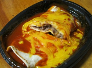 No, it turns out it isn’t. Enchiladas are made of corn tortillas, whereas burritos use wheat. The Wikipedia tells me that to be an enchilada, the tortilla needs to be covered in a chili-pepper sauce, since “enchilada is the past participle of the Spanish verb enchilar, ‘to add chile pepper to.'”