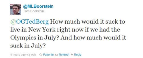 I just moved back to the city in November, so it’d probably be bad form to whine too much about all the theoretical tourists that would have come along with the Olympics, plus the various logistical nightmares it would inevitably bring. All that would certainly suck, though, especially when you consider many longtime New Yorkers struggle with the basics of subway etiquette.