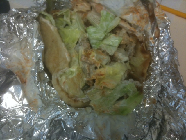 I’m on board with that, though, and this is a pretty awesome meal. The meats are both tender and peppery. The lamb in particular is amazingly seasoned, kind of like a peppery lamb meatball. And it all works well in conjunction with the slightly tangy, slightly sweet, creamy white sauce. The lettuce provides the crunch and a pathetic little nod to your recent health kid. The pita, which they heat on the grill before constructing the thing, is warm and strong, chewy and a little toasty.