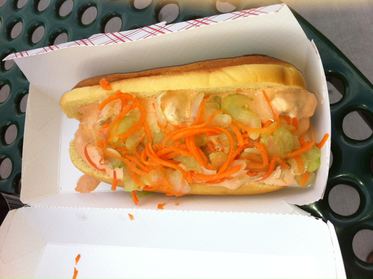 I should say though that the above-photographed Buffalo dog was the third I’ve had and also the third-best. It was purchased about an hour before game time, so perhaps it wasn’t as fresh as those produced in the high-turnover middle innings, or maybe the Box Frites staff weren’t fully warmed up yet. It had a little too much sauce, for one thing, which got messy — though not enough to trivialize the concept. And it just didn’t taste as awesome as the first two. Maybe the novelty’s wearing off?