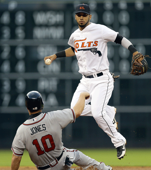 The fellow leaping over Larry Jones in the photograph below is named Marwin Gonzalez and he is supposedly a member of the Houston Astros, who wore some awesome, awesome throwbacks last night: