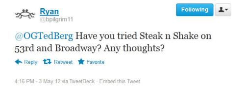 I haven’t tried that specific Steak N’ Shake, but I had a Steak N’ Shake burger in Florida and was underwhelmed. Despite all the hype around its arrival in New York, it doesn’t hold a candle to the new breed of highish-end fast-food burger places that have taken the city by storm. I only had one so, as with almost all sandwich reviews here, I’m working with a miserably small sample, but to me it’s not much of an upgrade over the best of the big fast-food chains (ie Wendy’s). Still tasty, don’t get me wrong, but not worth skipping Shake Shack or Five Guys for.
