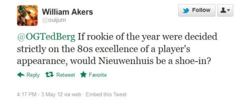 He’s certainly the early favorite. I haven’t had a good look at every one of the league’s rookies yet, obviously, but most of the good ones appear to have some sort of very baseball-y and typically late-90sish chin beard, and none can boast Nieuwenhuis’ flowing blond surfer-bro locks. If you’re strictly looking for guys who might be in an 80s movie, Bryce Harper has to be considered too. Also, Reds catcher Devin Mesoraco looks like he might play the best friend of the guy whose girlfriend dumps him for Kirk Nieuwenhuis.