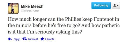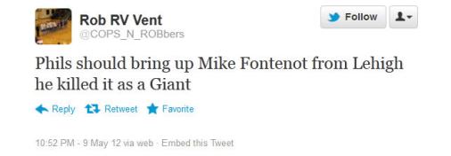 Toby Hyde tipped me to the current Phillie-fan clamor for Fontenot on the podcast we recorded last night that should be up later today. The situation is very different than the Mets’ in 2007: For one, Fontenot’s actually in the Phillies’ system, so it’s a lot less ridiculous for fans to be calling for him.