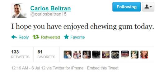 Selfish Beltran doesn’t care if you’re confused Posted on July 6, 2012 by Ted Berg Here is one of the greatest and most baffling Tweets of all time: What could it mean? [poll id=”113″] Share this: Click to share on X (Opens in new window) X Click to share on Facebook (Opens in new window) Facebook Like Loading... Related
