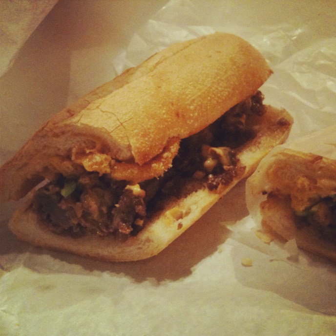 The second time, this cheesesteak almost tasted like a caricature of the sandwich I had the week before. I don’t know what went wrong in the process (or what went right the first time), but I suspect the proportions were off. By taste, at least, there was less steak and fewer jalapenos and way more miso Whiz and Funyuns. The Funyuns didn’t present as much crunch but the salt remained, and the extra miso Whiz meant that saltiness and miso flavor dominated the sandwich. Still really good, mind you, just nowhere near as delicious as the one I had the week before.