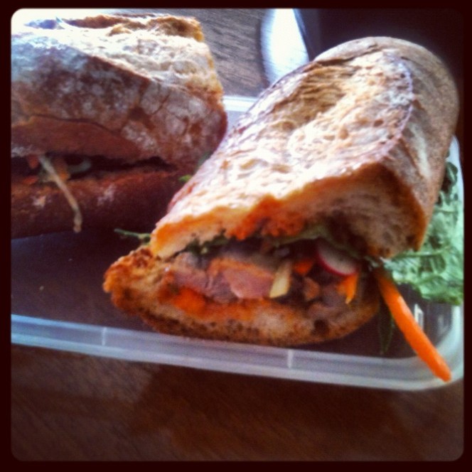 How it tastes: Tasty. It tastes primarily like the mix of hoison and chili sauces, but it so happens that’s a nice blend of sweetness and spiciness with flavors that go together well. And the vegetables, including the pickled radish, give it some of the flavors and textures of a typical banh mi.