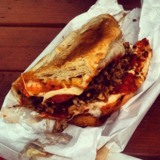 The best part is the bread. Baked locally at Ithaca Bakery, it’s way softer on the outside than most french bread you’ll find, so it toasts to only a mild crustiness. The inside stays soft and soaks up a lot of the sauce and greases, so basically you’ve just got the crust to shield your hands from all the pizza stuff and add a touch of crunch. In that way, it’s a lot like eating a folded slice of New York pizza, only a bit more substantial.