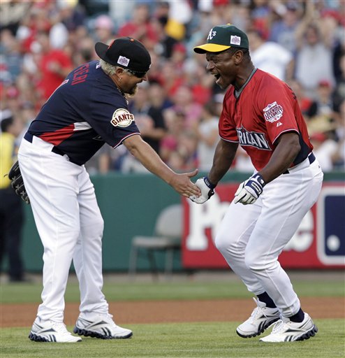 Here’s Rickey low-fiving Guy Fieri after homering in the All-Star Legends and Celebrity softball game in 2010. He also homered in the 2011 version of the event: